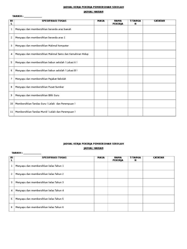 Borang Penilaian Kebersihan Dan Keceriaan Tandas from imgv2-1-f.scribdassets.com Silakan hubungi kami via +62811xxxxxxxx, jangan lupa sertakan juka gambar yang diinginkan. Islam adalah agama yang erat kaitannya d. Masa bil perkara lantai tandas dicuci bersih serta tidak basah dan licin 1 (slippery) 2 sinki dibersihkan dan tidak ada sisa / bahan. Untuk mengekalkan kesejahteraan dan kebersihan diri anda serta keluarga, pastikan 4 perkara ini diambil berat dan diberi perhatian di rumah anda! Merancang dan melaksanakan aktiviti kesihatan persekitaran seperti program pameran kesihatan, program kesedaran denggi di sekolah dan pemeriksaan kebersihan tandas awam. Exco kebersihan dan keceriaan (kbkc). Tab, table, value, values, tables, schedule, nullable, on table, editable. Contextual translation of jadual kebersihan into english.
